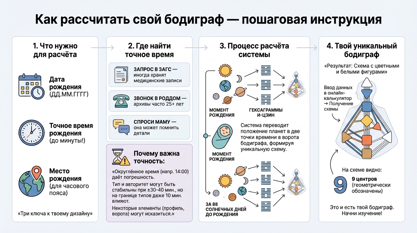 Если время известно с точностью до часа — бодиграф можно рассчитать, но некоторые элементы (профиль, отдельные ворота) могут оказаться неточными. Тип и авторитет обычно не меняются при погрешности до 30-40 минут, но бывают исключения: если ты «на границе» между типами, даже 10 минут могут сдвинуть результат.