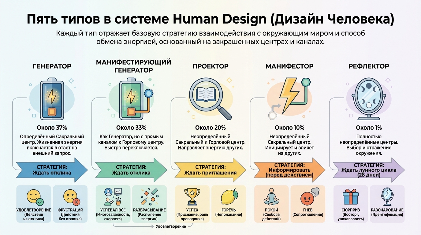 Когда рассчитаешь бодиграф, первое, на что стоит обратить внимание, — тип. В дизайне человека их пять, и каждый отражает базовую стратегию взаимодействия с окружающим миром.