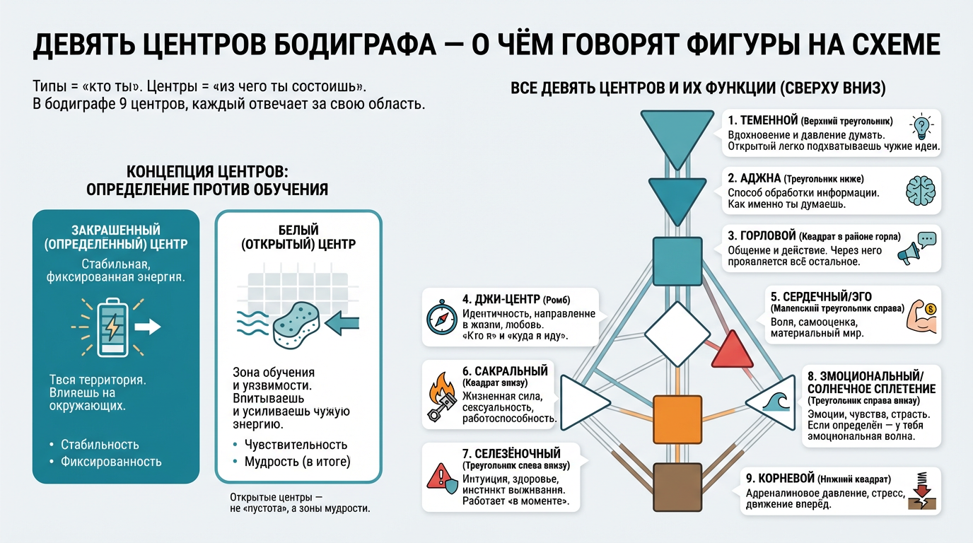 Если типы — это «кто ты», то центры — это «из чего ты состоишь». В бодиграфе 9 геометрических фигур, каждая отвечает за свою область.