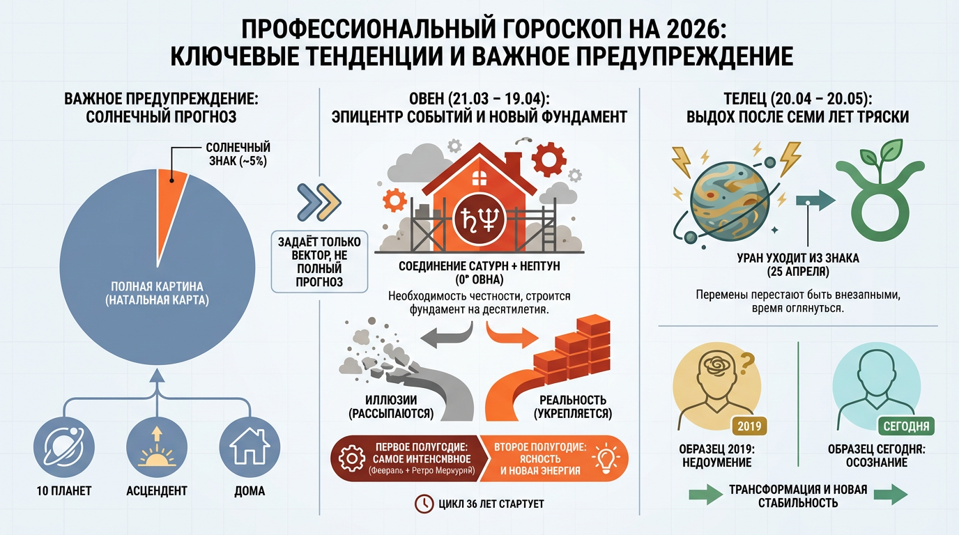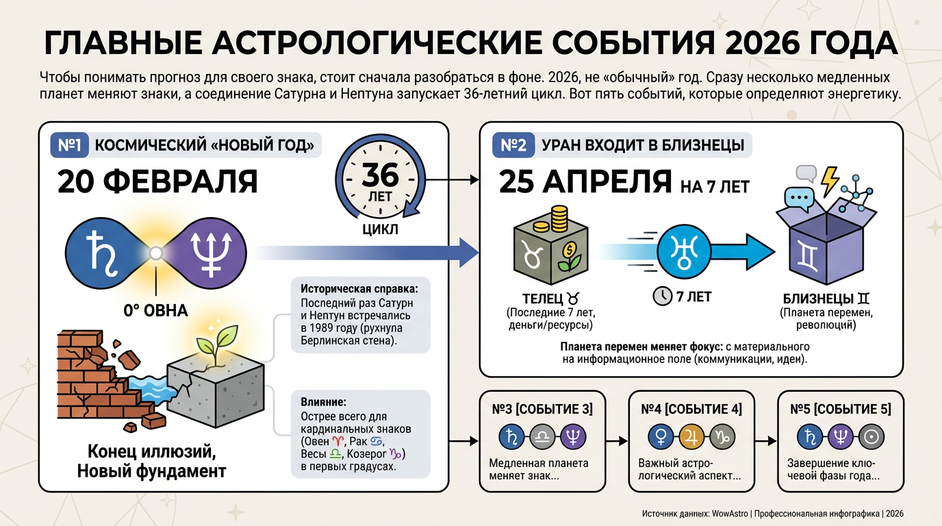 Этот прогноз устроен иначе. Здесь, конкретные астрологические события 2026 года с датами, которые можно проверить в любых эфемеридах. Соединение Сатурна и Нептуна 20 февраля, четыре затмения, Уран в новом знаке на семь лет, три ретрограда Меркурия. И уже от этих событий — разбор для каждого из двенадцати знаков. Не гадание, а навигация.