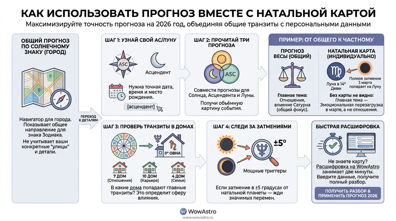 Чтобы этот прогноз работал не на сотни миллионов людей одного знака, а лично на тебя — получи расшифровку натальной карты на WowAstro. 299 ₽, две минуты ввода данных, и вместо общего гороскопа у тебя будет персональная карта транзитов на 2026.