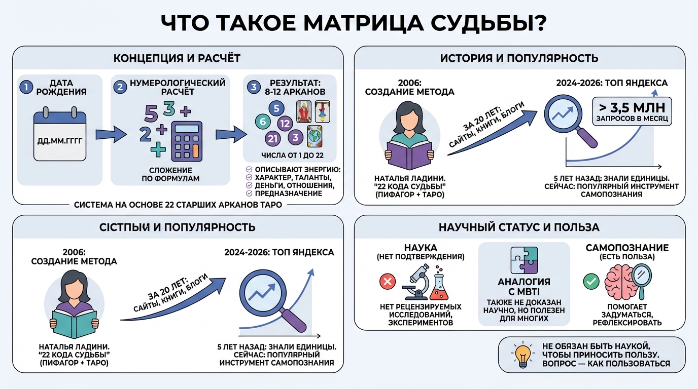 Метод создала Наталья Ладини в 2006 году. Она объединила нумерологию Пифагора с символикой Таро и выстроила систему расчёта, которую назвала «22 кода судьбы». За 20 лет метод разошёлся по сотням сайтов, десяткам книг и тысячам Instagram-блогов. В 2024-2026 годах запрос «матрица судьбы» стабильно держится в топе Яндекса — больше 3,5 миллиона в месяц. Ещё пять лет назад о матрице знали единицы. Сейчас это один из самых популярных запросов в нише самопознания.