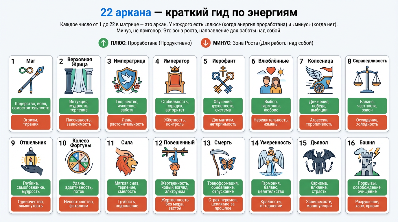 Каждое число от 1 до 22 в матрице — это аркан. У каждого есть «плюс» (когда энергия проработана) и «минус» (когда нет). Минус, не приговор. Это зона роста, направление для работы над собой.