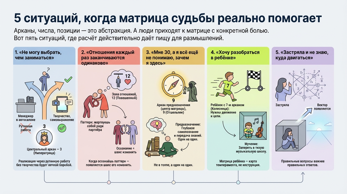 Арканы, числа, позиции — это абстракция. А люди приходят к матрице с конкретной болью. Вот пять ситуаций, где расчёт действительно даёт пищу для размышлений.