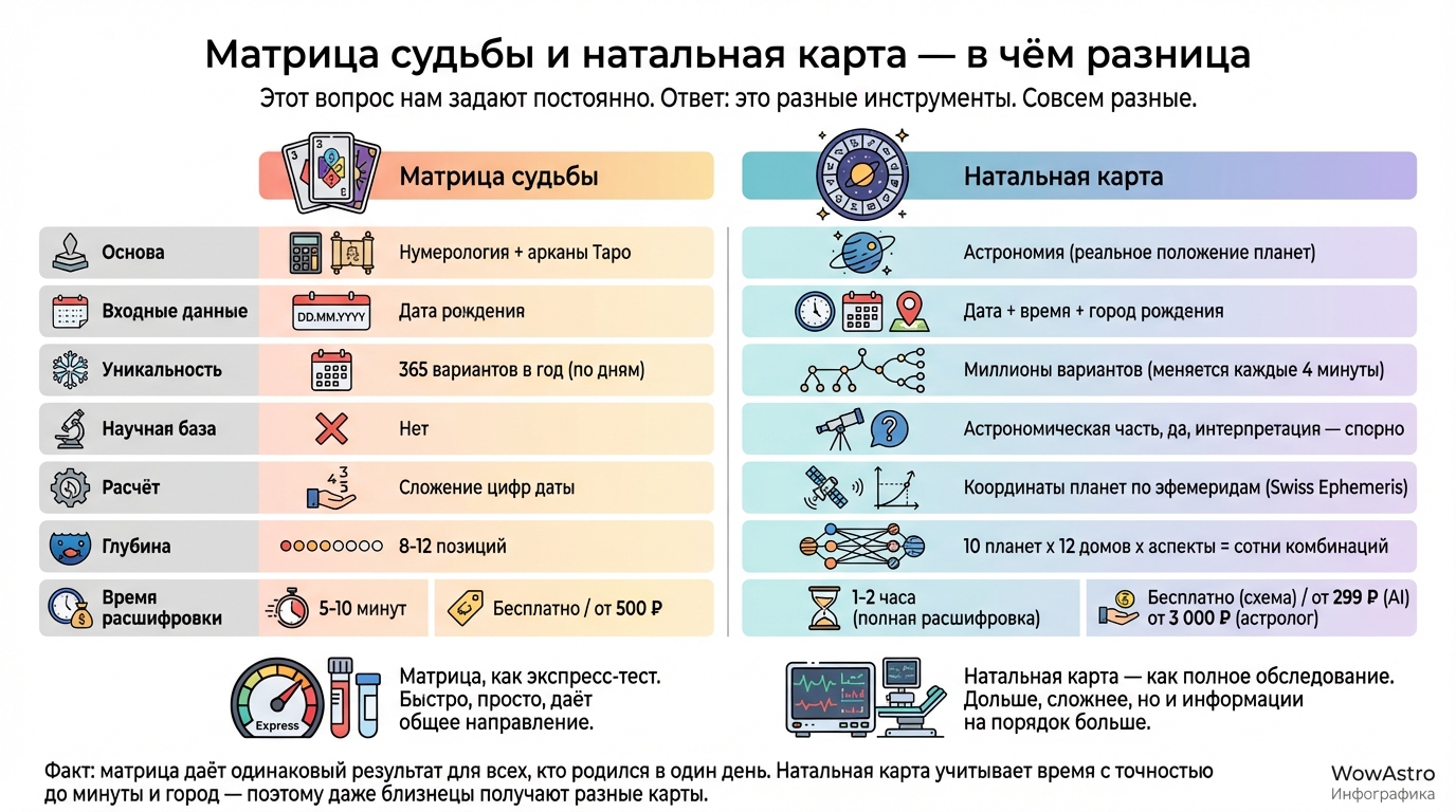 Тут честно скажу: мы в WowAstro делаем натальные карты, поэтому наше мнение не нейтрально. Но вот факт: матрица даёт одинаковый результат для всех, кто родился в один день. Натальная карта учитывает время с точностью до минуты и город — поэтому даже близнецы, родившиеся с разницей в 10 минут, получают разные карты.