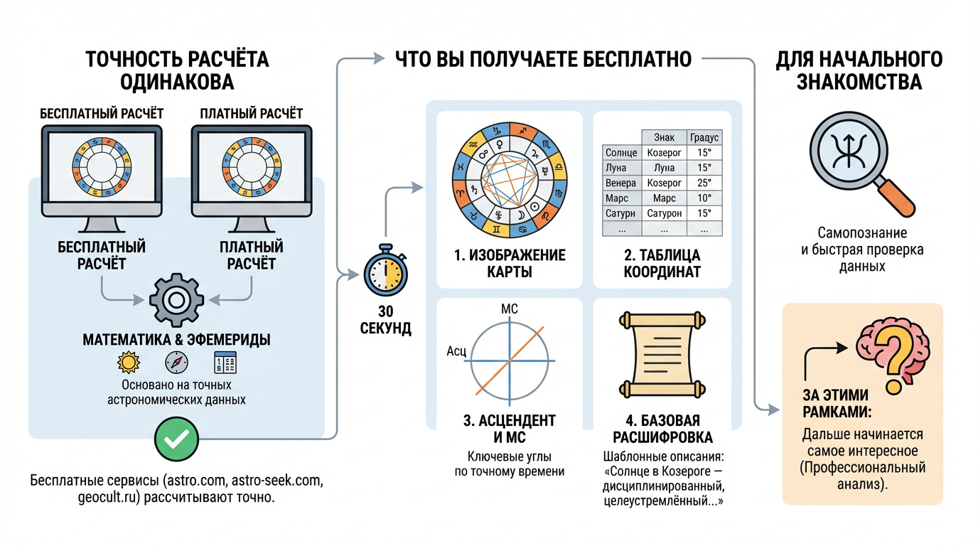 Бесплатные астропроцессоры (astro.com, astro-seek.com, geocult.ru) позволяют рассчитать натальную карту онлайн бесплатно, и делают это точно. Математика одна и та же — эфемериды, астрологические системы домов, координаты планет. Здесь нечего улучшать за деньги: бесплатный расчёт натальной карты и платный дают одинаковое изображение.