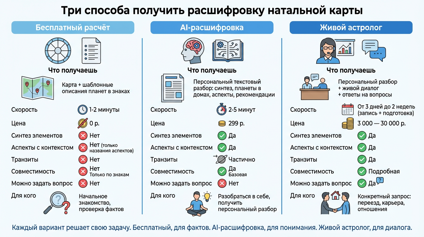 Каждый вариант решает свою задачу. Бесплатный, для фактов. AI-расшифровка, для понимания. Живой астролог, для диалога.