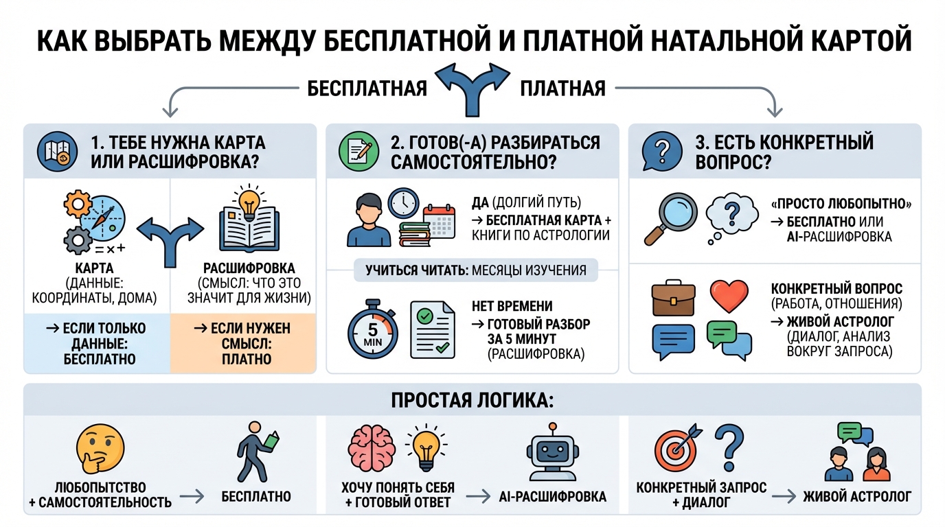 Карта — это данные: координаты планет, положения домов гороскопа. Расшифровка — это смысл: что эти данные значат для жизни. Если нужны только данные, бесплатно. Если нужен смысл, платно.
