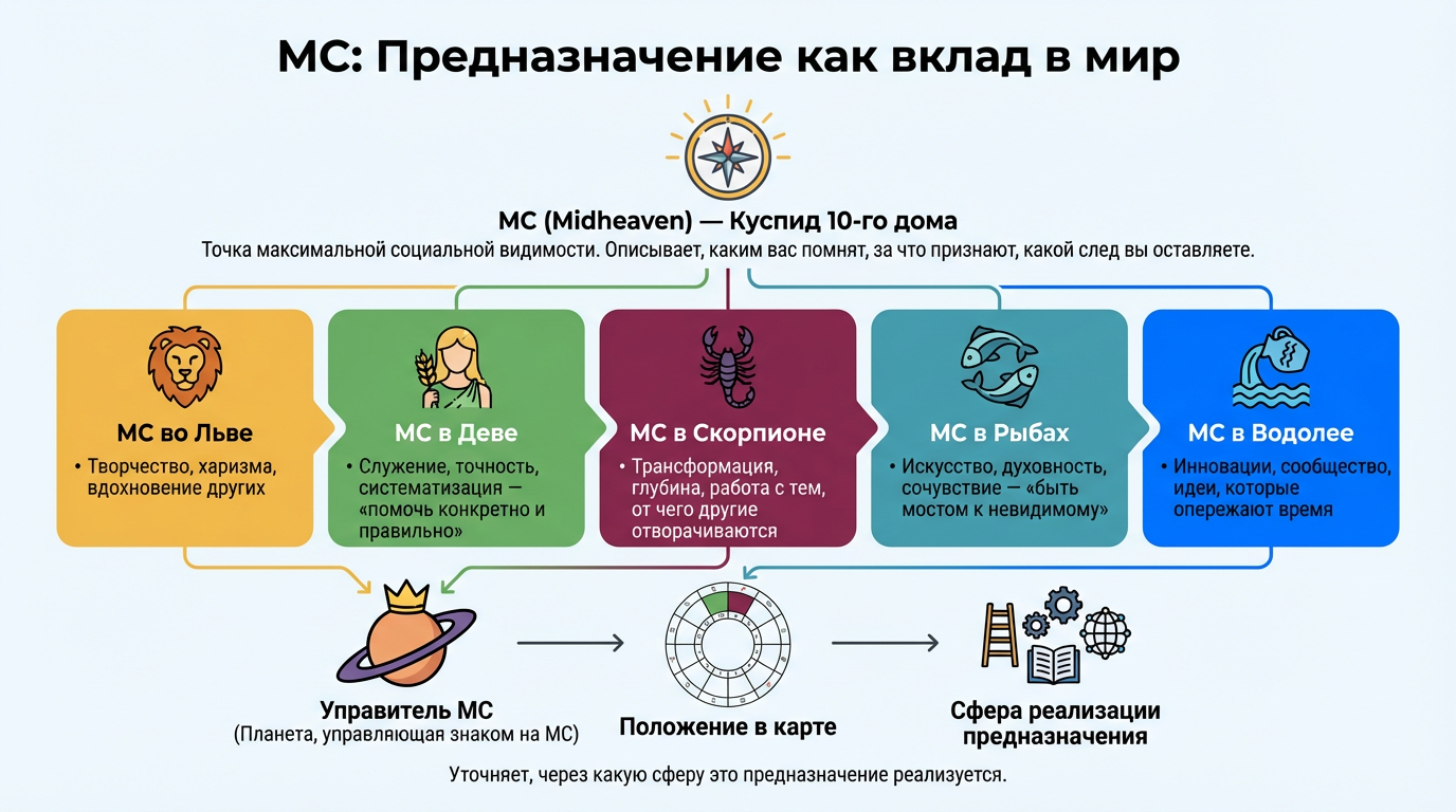 Но знак МС — это только часть картины. Управитель МС (планета, управляющая знаком на МС) и её положение в карте уточняют, через какую сферу это предназначение реализуется.
