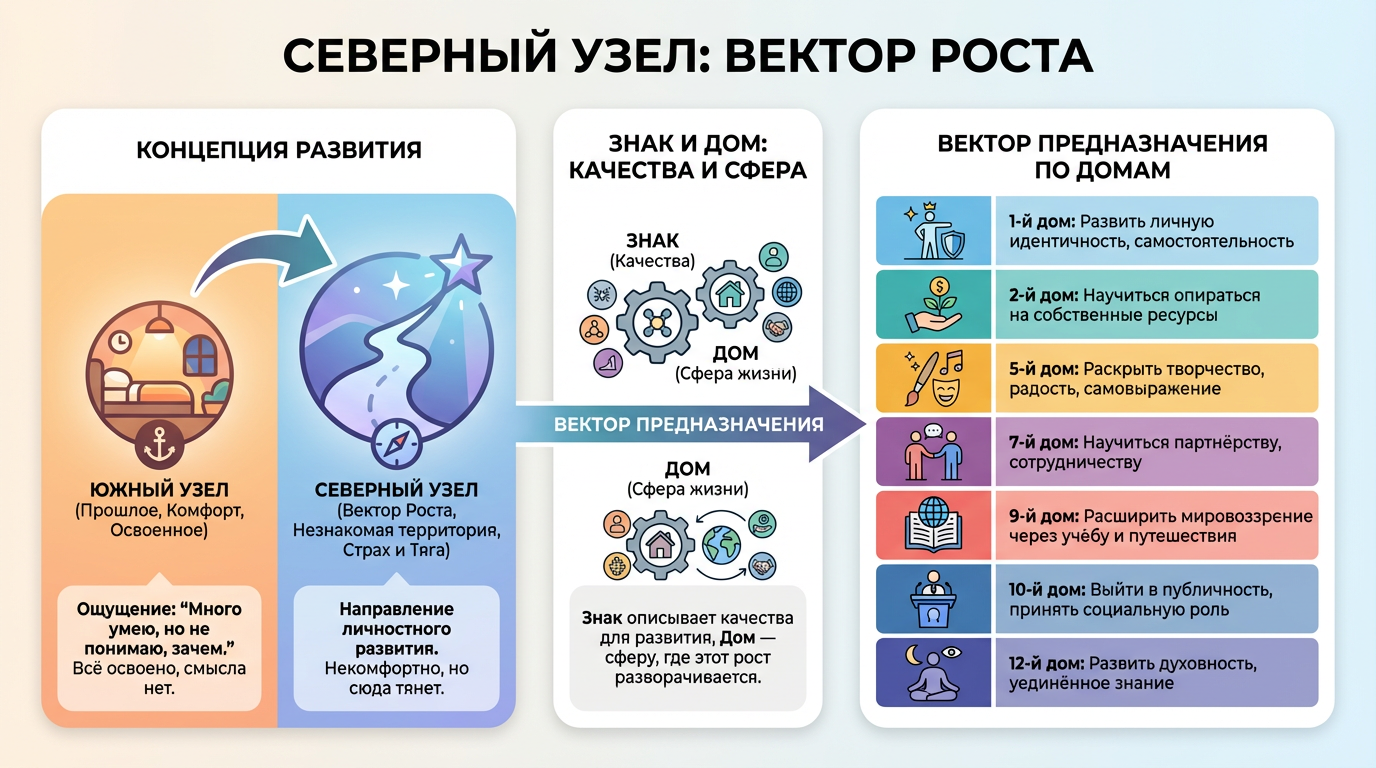 Северный узел — точка в карте, указывающая направление личностного развития в этой жизни. Он всегда немного некомфортен: это незнакомая территория, куда тянет, но страшно.