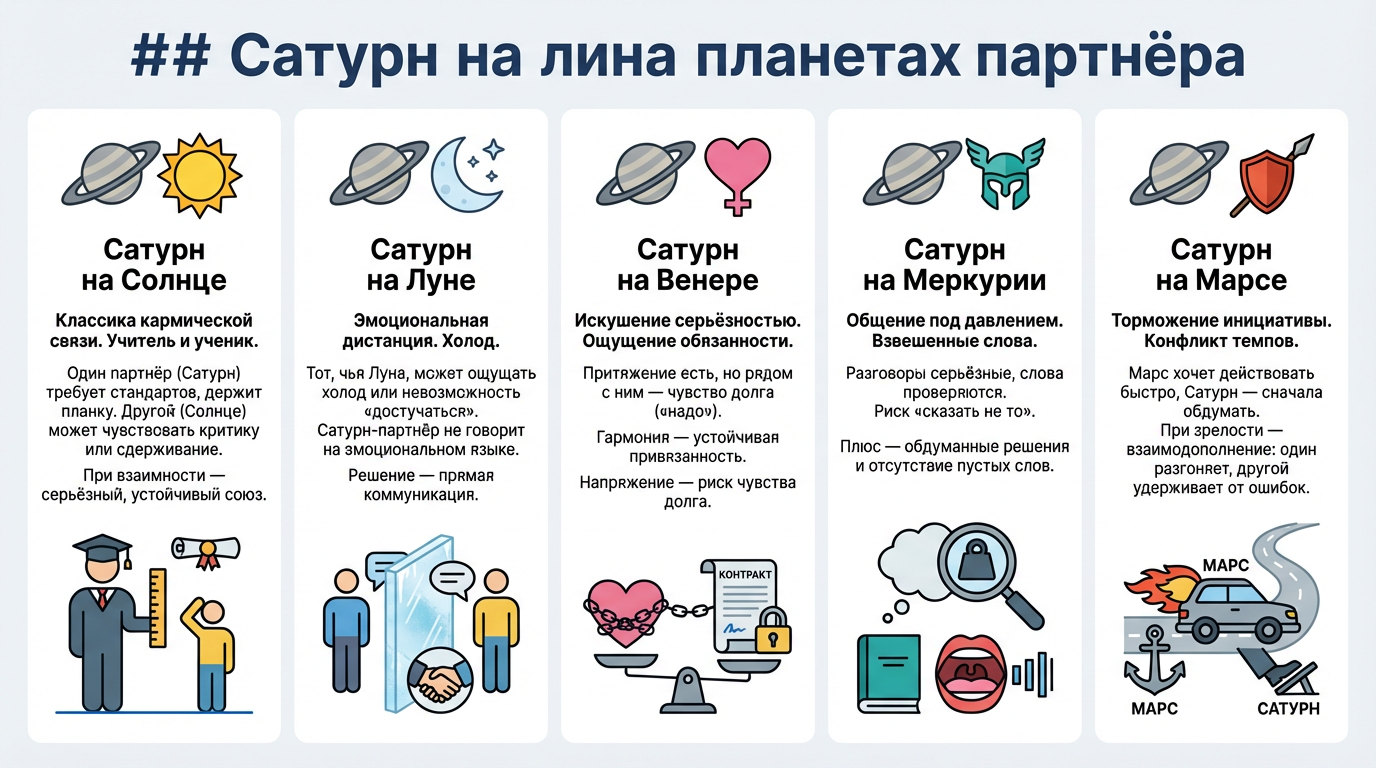Главная ошибка — считать Сатурн «плохой» планетой в синастрии. Сатурн не разрушает, он проверяет. Гармоничные аспекты (тригон, секстиль) дают надёжность и взрослость без ощущения клетки. Напряжённые (квадрат, оппозиция) — ограничение, которое может ощущаться как давление, но именно оно заставляет расти.