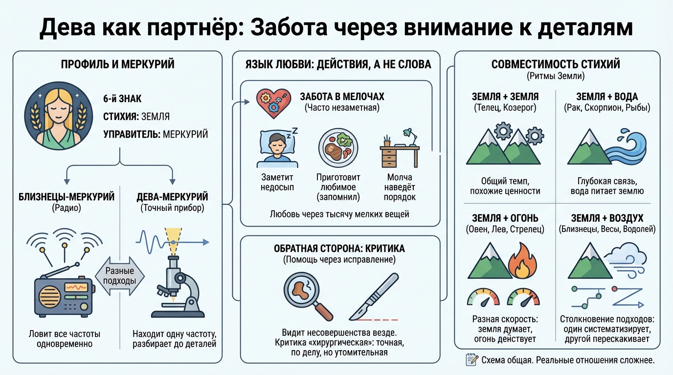 Практичность и внимание к мелочам — натура земного знака. С другими земными знаками (Телец, Козерог) — общий темп и похожие ценности, гармоничный ритм. С водными (Рак, Скорпион, Рыбы) — глубокая связь: вода питает землю. С огненными (Овен, Лев, Стрелец) — разная скорость: земля думает, огонь действует. С воздушными (Близнецы, Весы, Водолей) — столкновение подходов: один систематизирует, другой перескакивает. Со знаком Девы связано стремление к порядку: эта пара любого из стихий работает, если второй принимает потребность Девы во взаимопонимании через детали, а не через громкие слова. Но это схема. Реальные отношения всегда сложнее любой схемы.