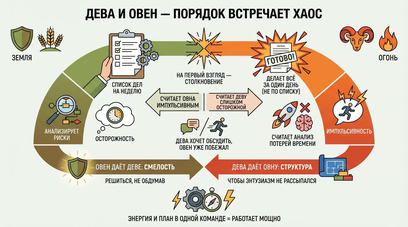 На первый взгляд — столкновение. Дева считает Овна импульсивным. Овен считает Деву слишком осторожной. Дева хочет обсудить, Овен уже побежал.