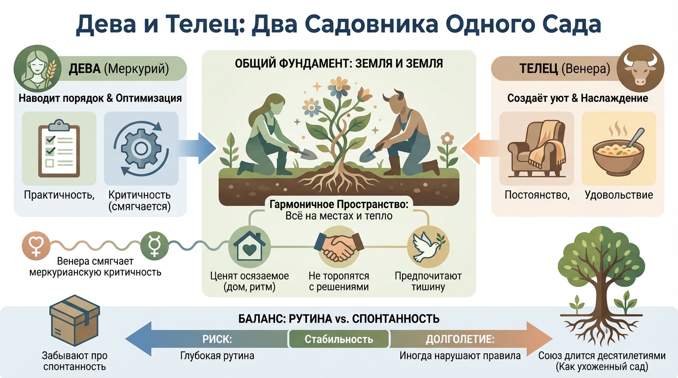 Земля и Земля. Общий фундамент: практичность, постоянство, верность. Дева наводит порядок. Телец создаёт уют. Вместе — пространство, где всё на своих местах и при этом тепло.