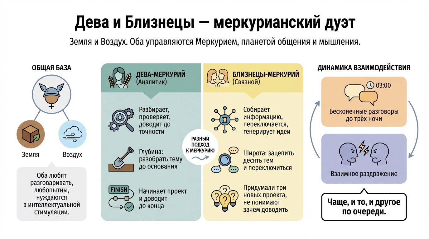 Земля и Воздух. Оба управляются Меркурием, планетой общения и мышления. Но Меркурий у них работает по-разному. Дева-Меркурий — аналитик: разбирает, проверяет, доводит до точности. Близнецы-Меркурий, связной: собирает информацию, переключается, генерирует идеи.