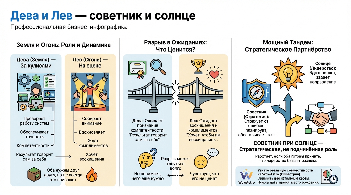 Лев хочет, чтобы им восхищались. Дева, чтобы её компетентность замечали. Лев ждёт комплиментов. Дева считает, что результат говорит сам за себя. Этот разрыв может тянуться долго — Лев чувствует, что его не ценят, Дева не понимает, чего ещё нужно, если и так всё сделано правильно.