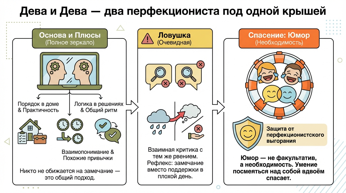 Ловушка, тоже очевидна. Два перфекциониста, которые критикуют друг друга с тем же рвением, с которым критикуют себя. Если у одного плохой день — второй добавит замечание вместо поддержки. Не со зла, просто рефлекс. Юмор в этой паре, не факультатив, а необходимость. Умение посмеяться над собой вдвоём спасает от взаимного перфекционистского выгорания.