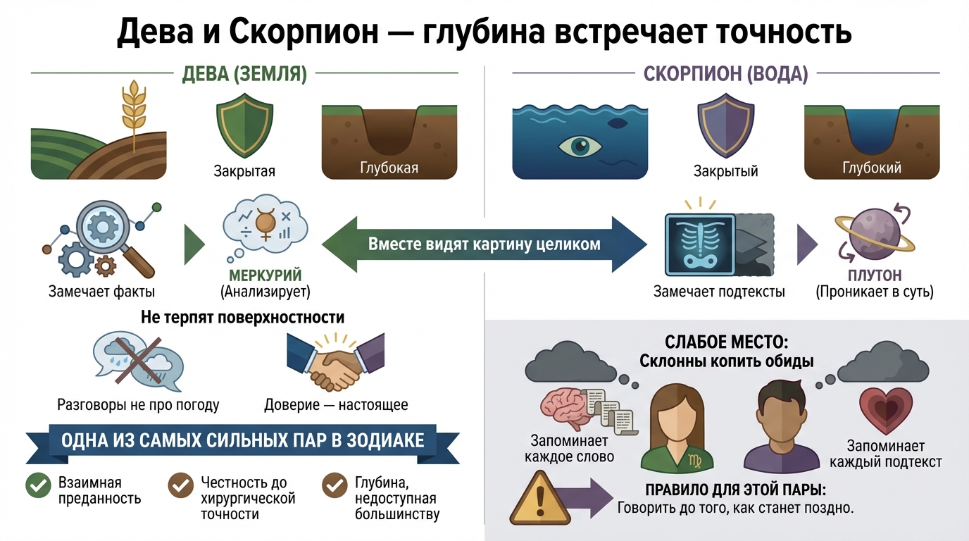 Земля и Вода. Оба закрытые. Оба глубокие. Оба замечают то, что другие пропускают, Дева замечает факты, Скорпион — подтексты. Вместе они видят картину целиком.