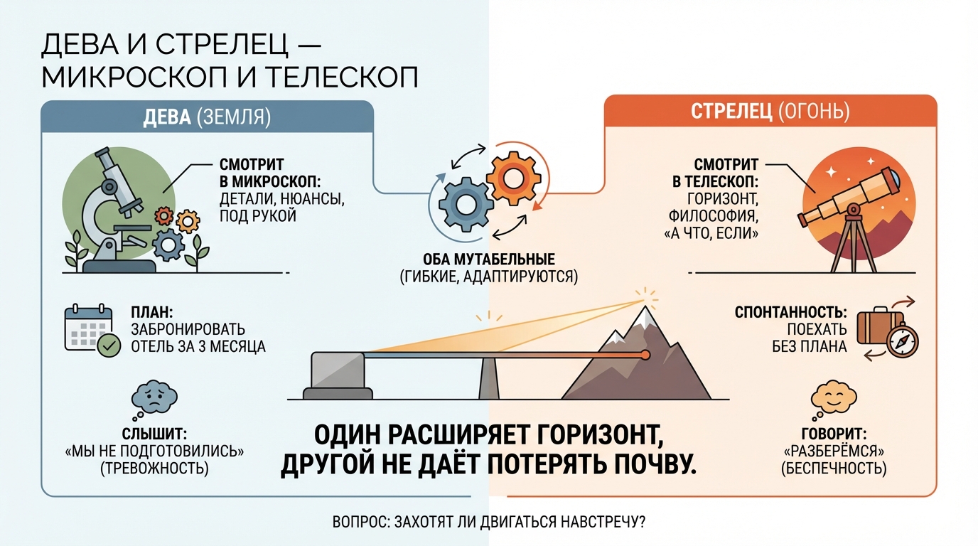 Земля и Огонь. Оба — мутабельные знаки: оба гибкие, оба адаптируются. Но смотрят в разные стороны. Дева, в микроскоп: детали, нюансы, то, что под рукой. Стрелец, в телескоп: горизонт, философия, «а что, если».