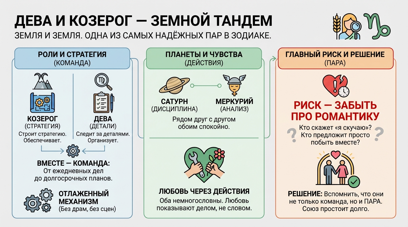 Оба немногословны в чувствах. Оба показывают любовь через действия, а не через слова. Козерог обеспечивает. Дева организует. Никаких драм, никаких сцен — всё работает как отлаженный механизм.