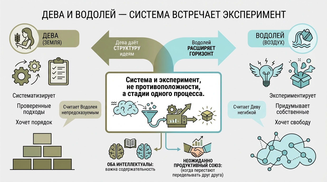 Земля и Воздух. Дева систематизирует. Водолей экспериментирует. Дева следует проверенным подходам. Водолей придумывает собственные.