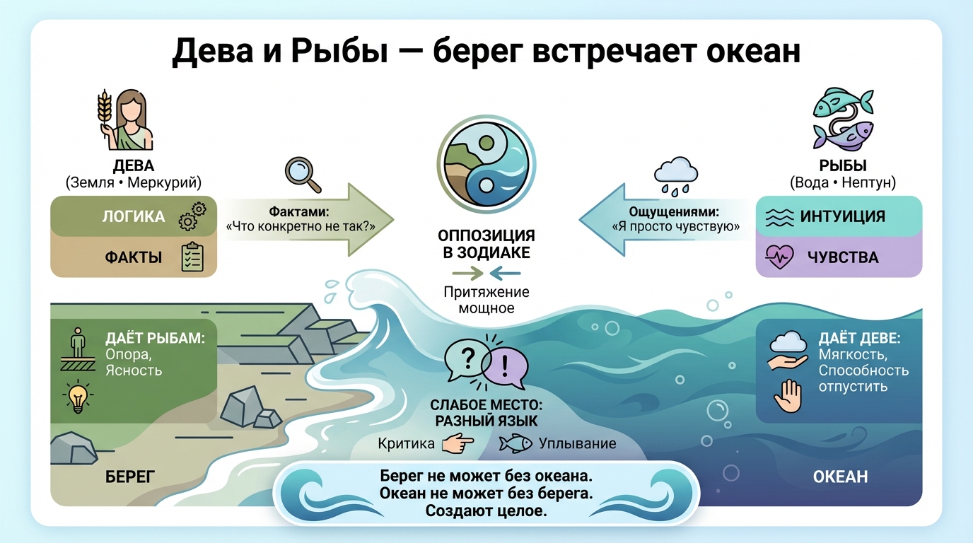 Дева и Рыбы стоят напротив друг друга в зодиакальном круге. Это оппозиция — один из самых сильных аспектов в астрологии. Земля и Вода. Меркурий и Нептун. Логика и интуиция. Факты и чувства.