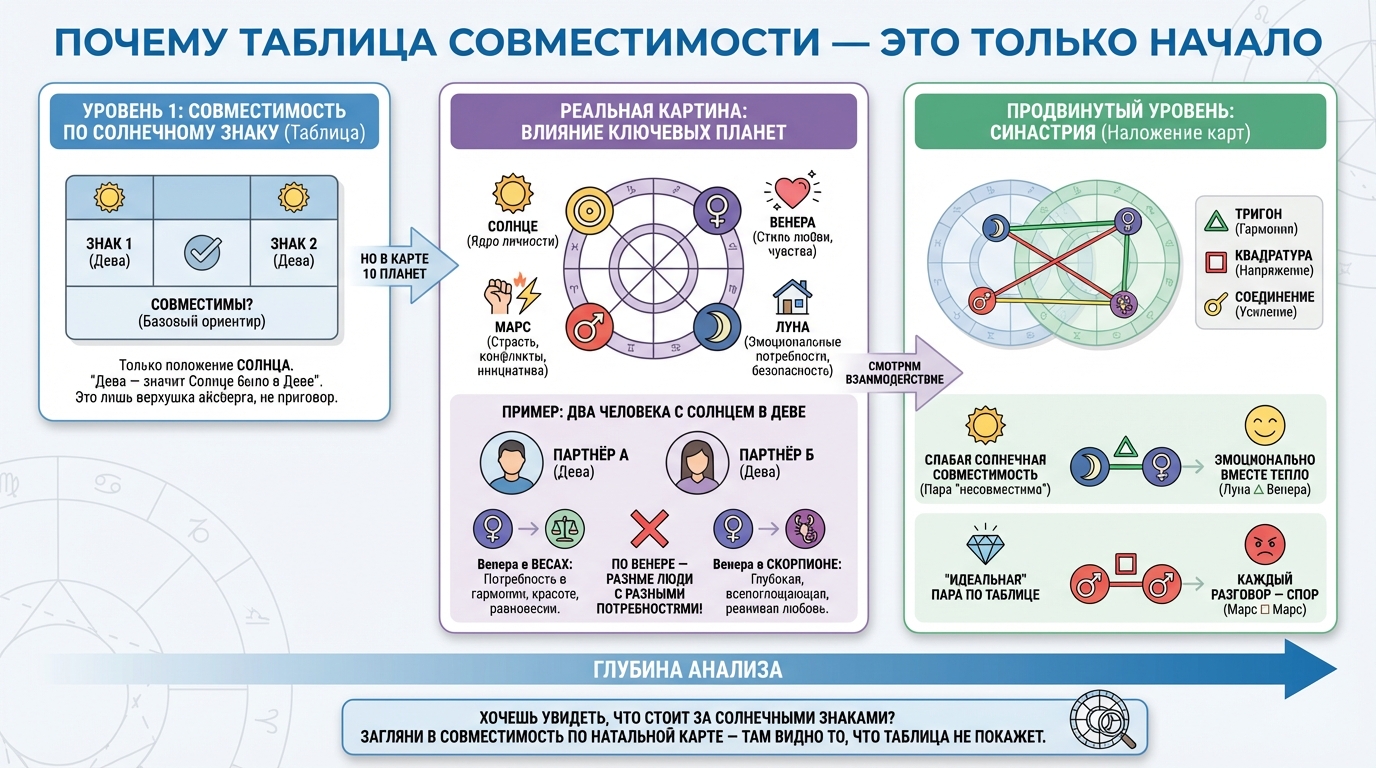 Хочешь увидеть, что стоит за солнечными знаками? Загляни в совместимость по натальной карте — там видно то, что таблица знаков не покажет.