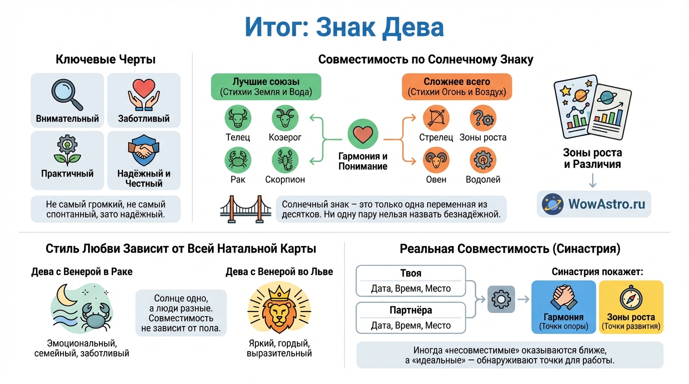По солнечному знаку Деве лучше всего подходят Телец, Козерог, Рак и Скорпион. Земные знаки разделяют потребность в стабильности и практичности, водные — добавляют эмоциональную глубину. Но реальная совместимость зависит от всей натальной карты, не только от Солнца.