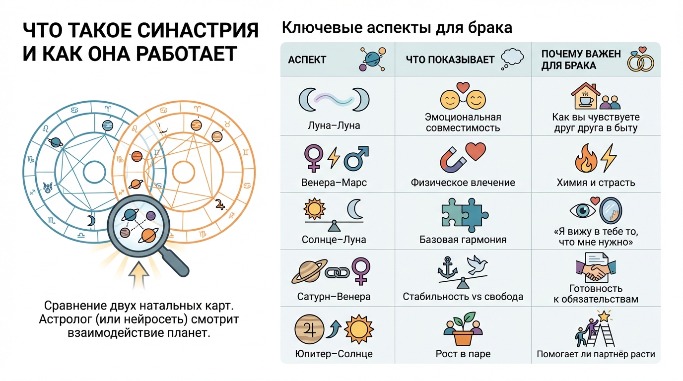 Совместимость в браке — не рулетка. Синастрия показывает, где пара в гармонии, а где — зоны работы. Это не гарантия счастья и не приговор к разводу. Это инструмент осознанного выбора.