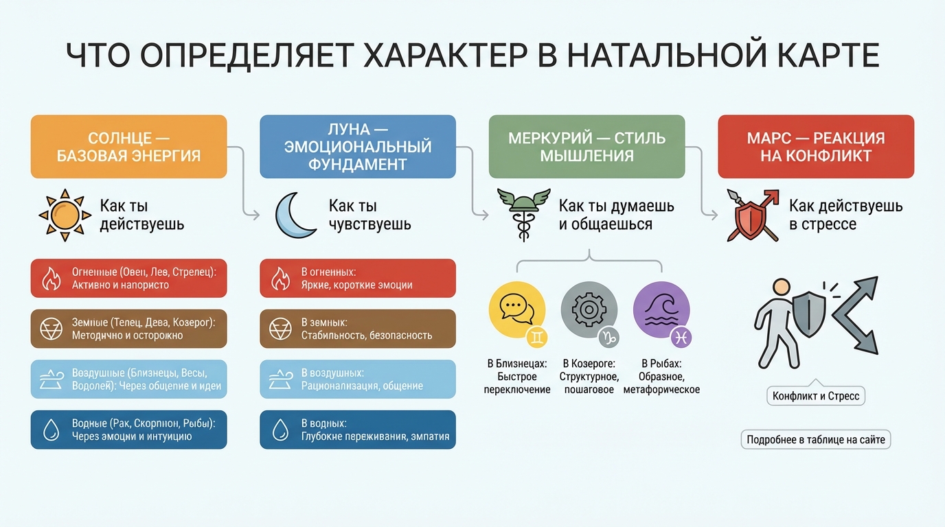 Характер — многослойная система. Знак зодиака показывает верхний слой. Натальная карта показывает все слои: эмоции (Луна), мышление (Меркурий), действие (Марс), ценности (Венера) и глубинную мотивацию (Плутон).
