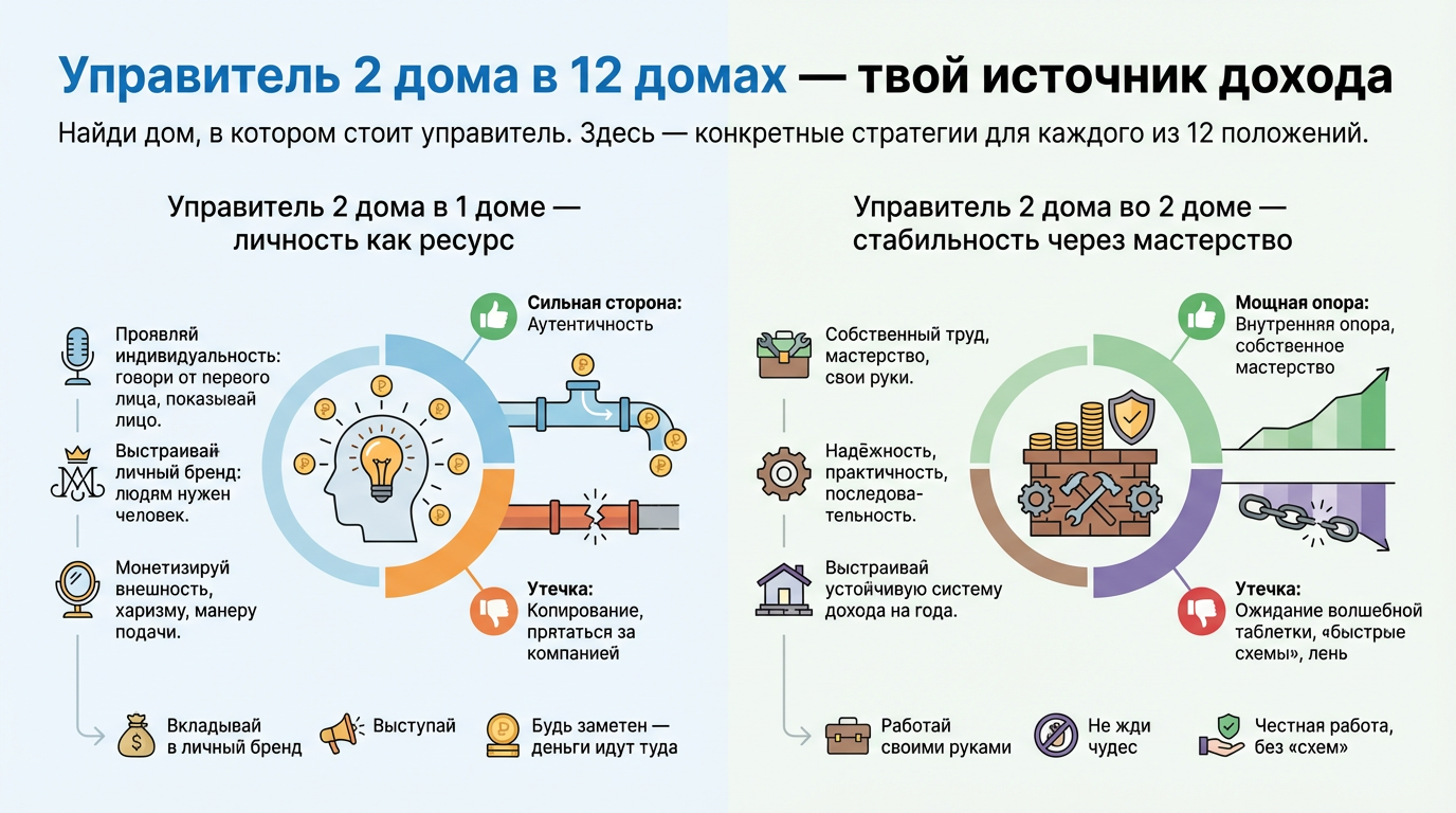 Важный нюанс: 2 дом не имеет прямого отношения к профессии (профессию определяют иначе). Он отвечает за ресурс, навык, энергию — то, ЧТО ты монетизируешь, а не за название должности.