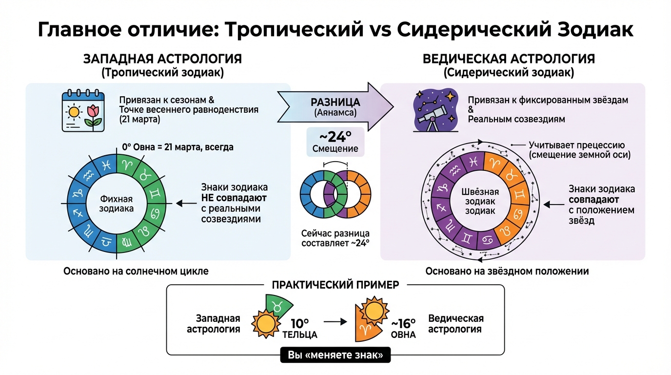 Ведическая астрология использует сидерический зодиак — привязанный к фиксированным звёздам. Учитывает прецессию — медленное смещение земной оси. Сейчас разница между тропическим и сидерическим зодиаком составляет ~24° (аянамса).