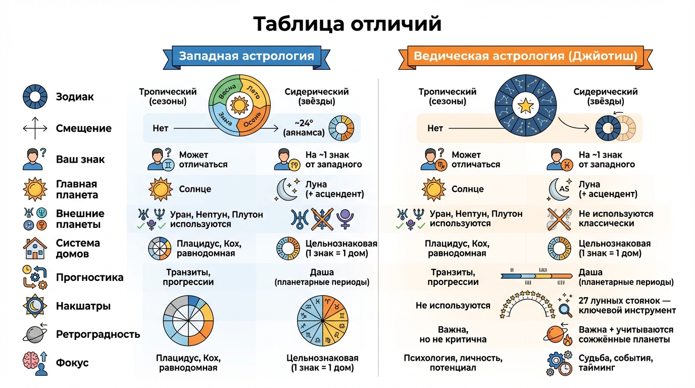 Ведическая и западная астрология — два отдельных подхода к одним и тем же планетам. Они используют разные зодиаки, разные системы домов, разные прогностические техники. И обе работают — но по-своему.