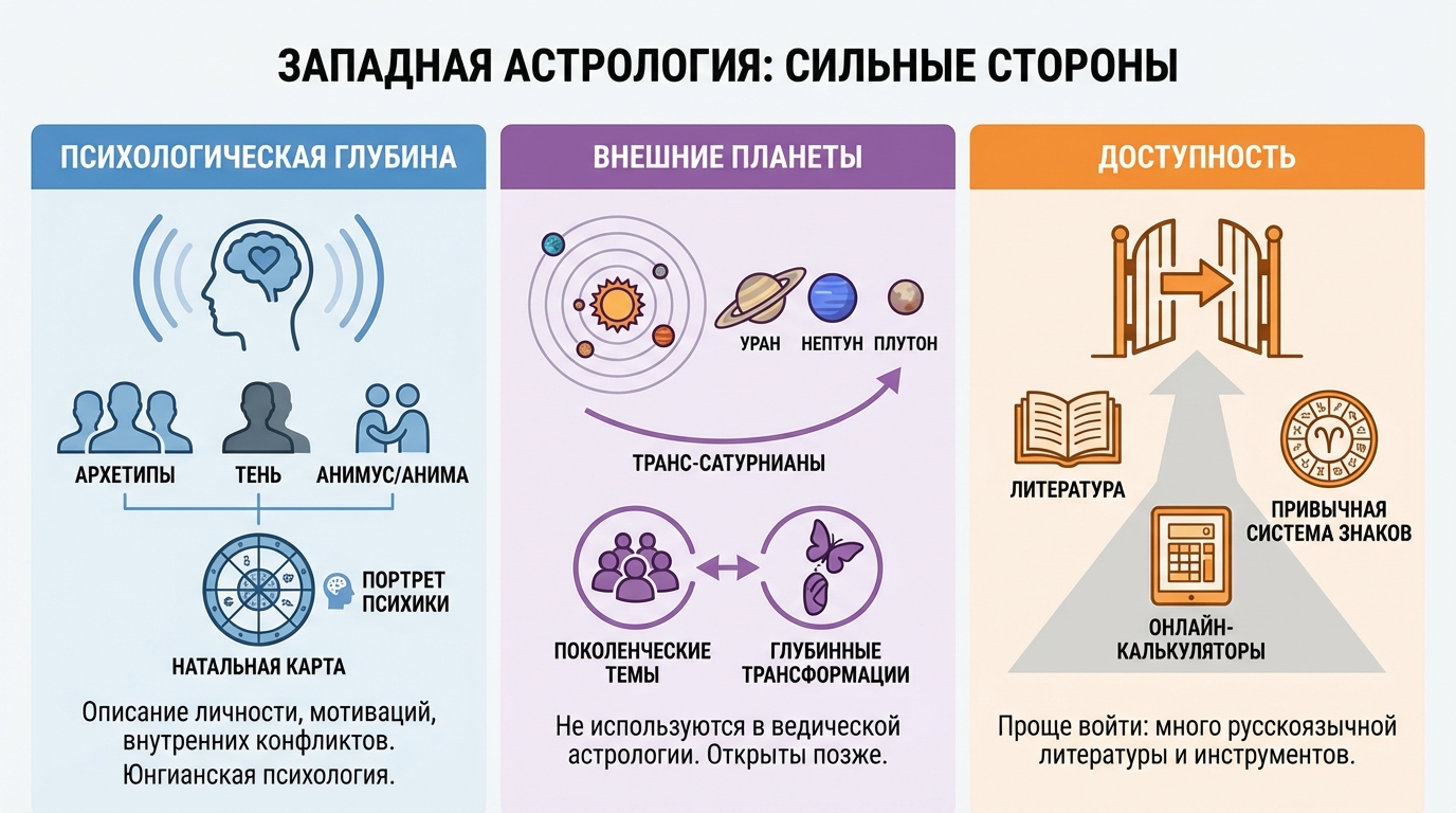 Психологическая глубина. Западная астрология сильна в описании личности, мотиваций, внутренних конфликтов. Она впитала юнгианскую психологию: архетипы, тень, анимус/анима. Натальная карта в западной традиции — это портрет психики.
