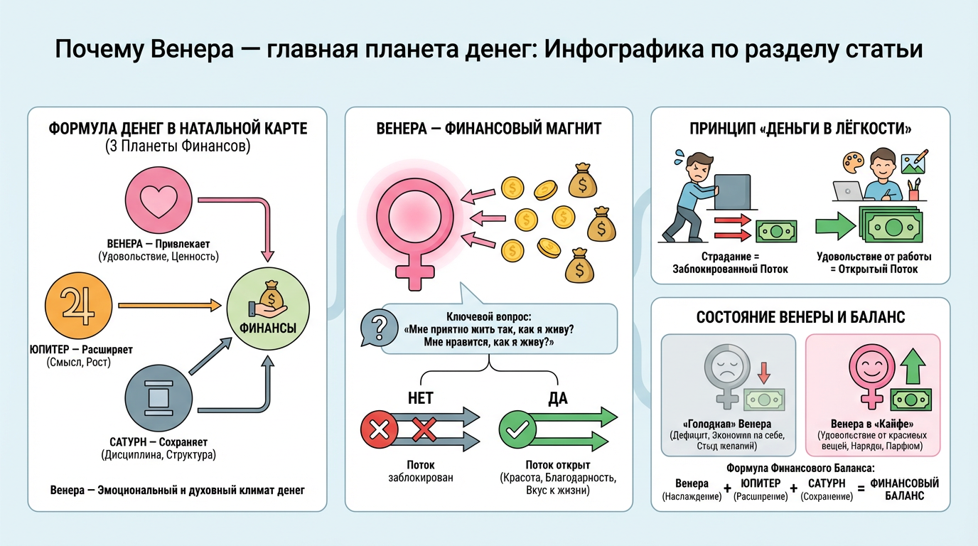 Венера — ваш внутренний барометр достатка. Когда вы живёте в ладу с ней — деньги текут свободно. Когда подавляете её потребности — финансовый поток замедляется, а траты растут.