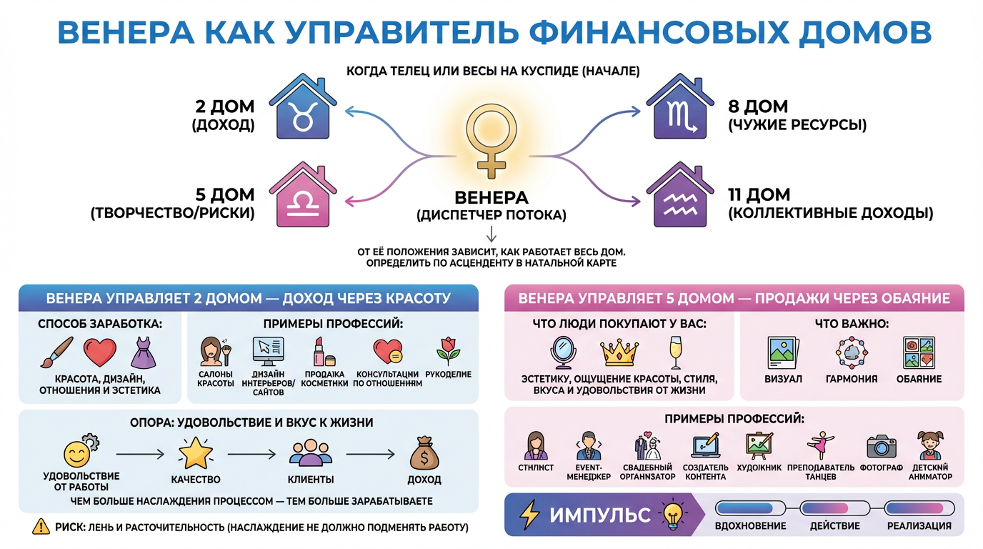 Ещё один важный фактор — когда Венера управляет одним из финансовых домов. Это происходит, когда знак Тельца или Весов стоит на куспиде (начале) 2, 5, 8 или 11 дома. В этом случае Венера становится «диспетчером» финансового потока — от её положения зависит, КАК работает весь дом.