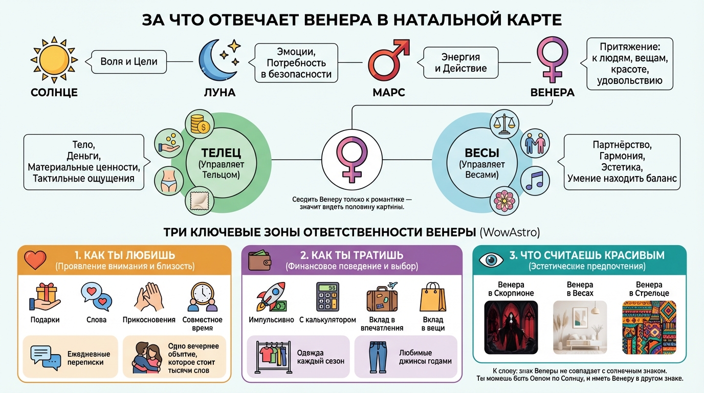 По опыту расшифровок на WowAstro — положение Венеры в натальной карте отвечает за три вещи одновременно, и люди обычно удивляются третьей. Так что влияние Венеры в гороскопе гораздо шире, чем кажется, в том числе в женском гороскопе она играет одну из ключевых ролей.