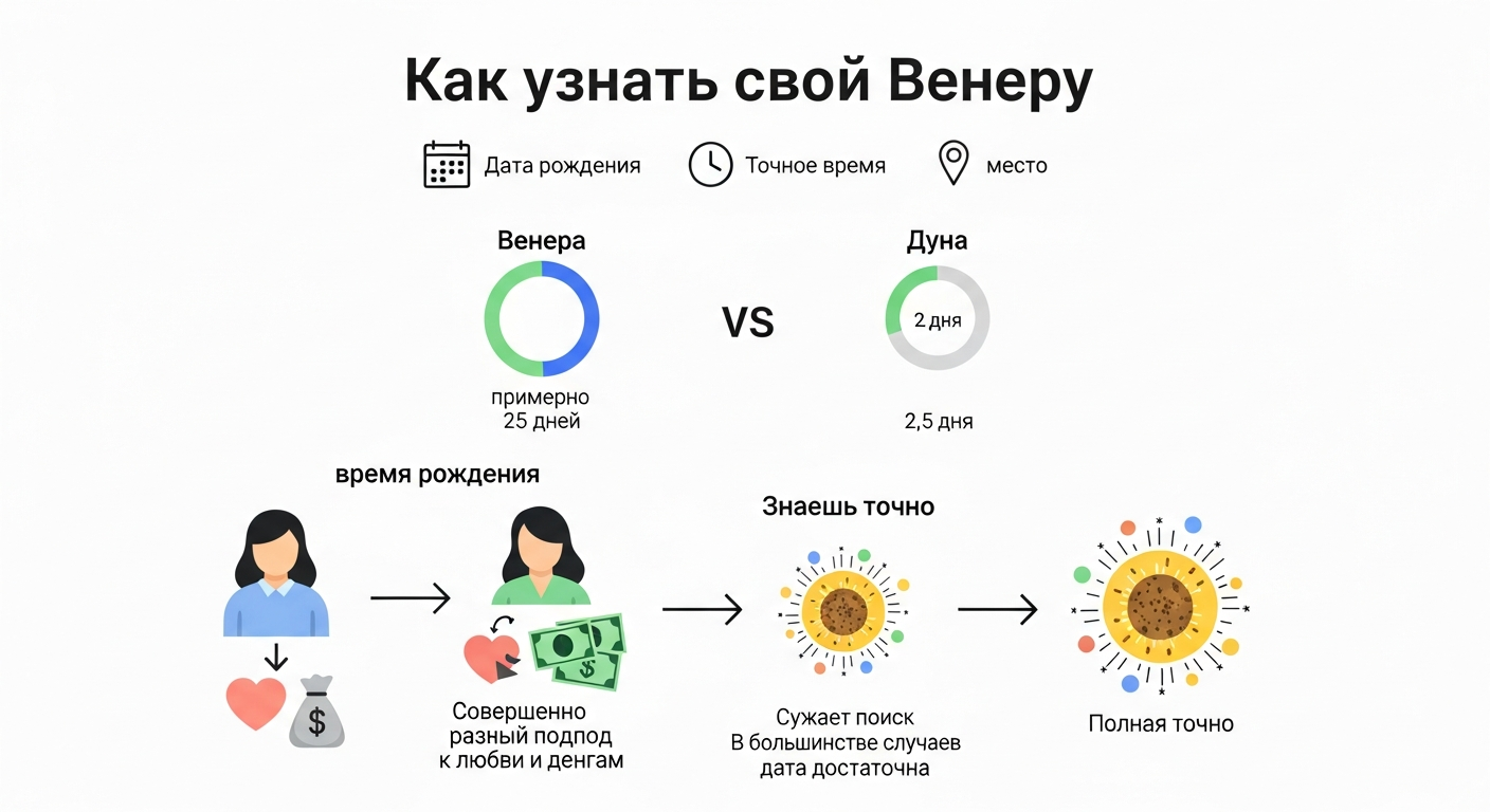 Если время рождения не знаешь точно, но знаешь дату — это сужает поиск. Венера не прыгает по знакам так быстро, как Луна, поэтому в большинстве случаев дата достаточна. Но для полной картины (дом Венеры, аспекты) время всё-таки нужно.