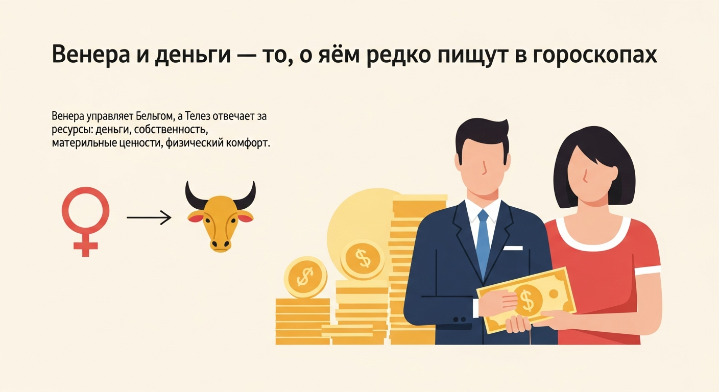 Ещё несколько лет назад о Венере писали исключительно в контексте любви и романтики. Сейчас астрологическое сообщество всё больше говорит о ресурсной стороне, и не зря. В астрологии Венера управляет Тельцом, а Телец отвечает за ресурсы: деньги, собственность, материальные ценности, физический комфорт.