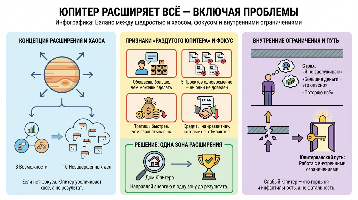 Проблема не в Юпитере. Проблема в том, что тебе забыли рассказать, как именно он работает. Юпитер — не банкомат и не волшебная палочка. Это магнит изобилия: он показывает, через что растут доходы и репутация. Но магнит без металла не работает — расширять придётся тебе.