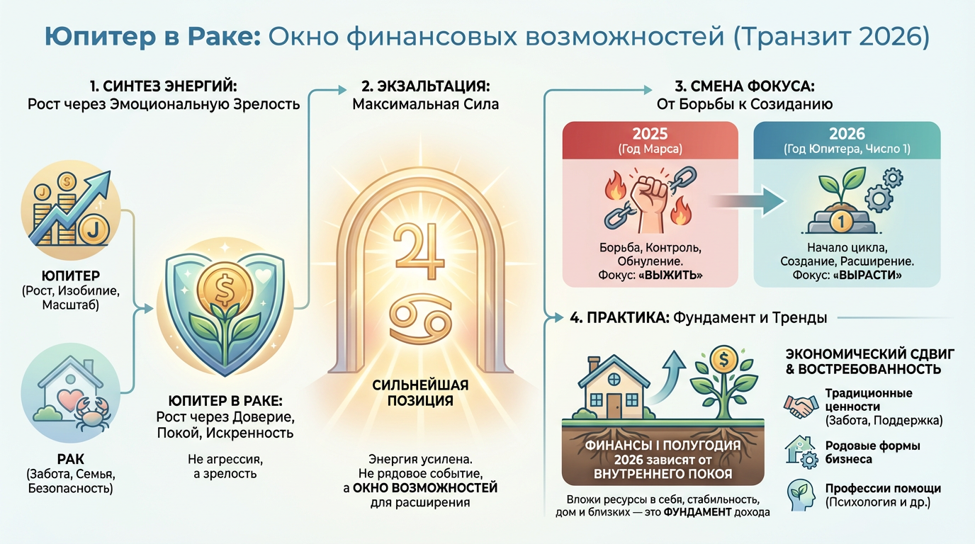 В этой статье — разбор Юпитера в Раке по 12 домам с финансовым фокусом. Для каждого дома — конкретные рекомендации: через что зарабатывать, куда инвестировать и какие действия предпринять до конца транзита. Мы также разберём, как этот транзит активирует финансовую формулу 2-5-8-11, что делать, если Юпитер попал в «сложный» дом, и составим план на оставшиеся три месяца.