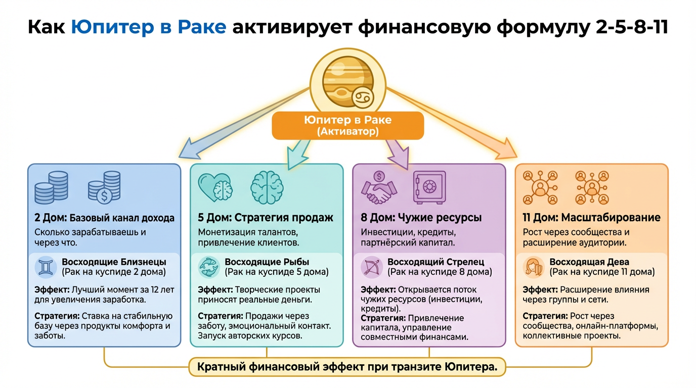 Формула денег описывает четыре финансовых дома натальной карты. Если транзитный Юпитер проходит через один из них — эффект кратный. Особенно мощно Юпитер работает, проходя через 2 дом (рост личного дохода) и 11 дом (расширение через сообщества). Формула 2-5-8-11 — это базовая система для анализа денег в натальной карте, и Юпитер в Раке временно усиливает один из её элементов.