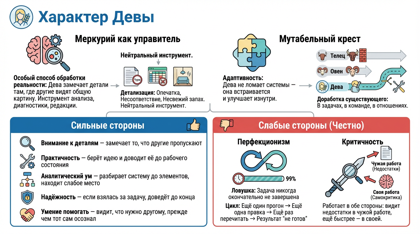 Начнём с того, что отличает Деву от остальных одиннадцати. Меркурий как управитель создаёт особый способ обработки реальности: Дева замечает детали там, где другие видят общую картину. Опечатка в тексте, несоответствие в таблице, несвежий запах в комнате — это не придирчивость. Это тот же инструмент, который делает Деву блестящим аналитиком, диагностом или редактором. Инструмент можно использовать во вред или на пользу — сам по себе он нейтрален.
