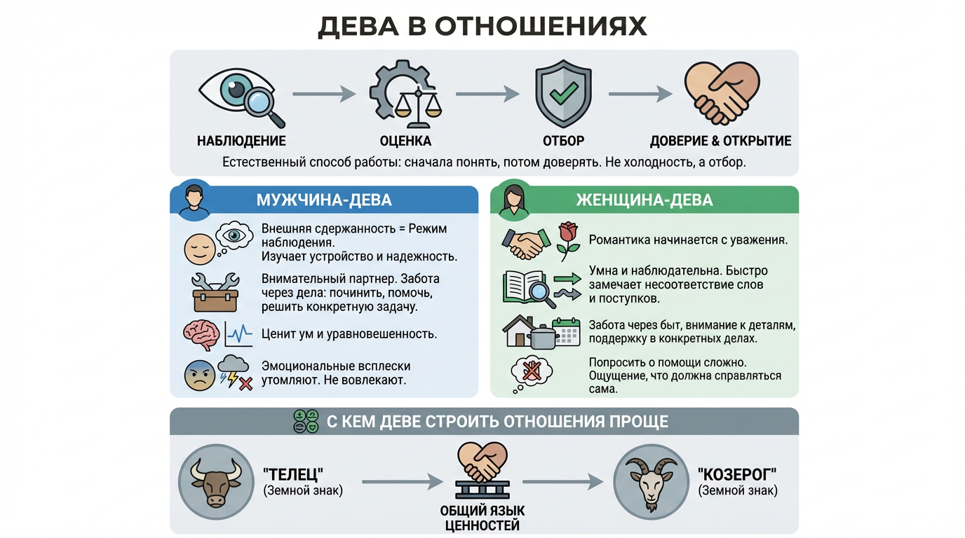 Внешне сдержан — это легко принять за незаинтересованность. На самом деле это режим наблюдения. Мужчина-Дева изучает: как человек устроен, как принимает решения, насколько можно доверять.