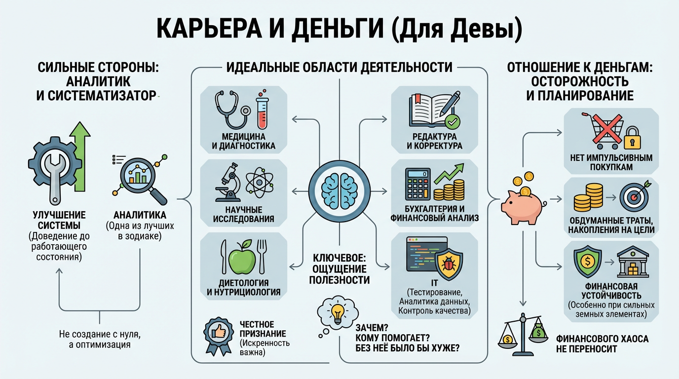 Области, где Дева в своей среде: медицина и диагностика, редактура и корректура, научные исследования, бухгалтерия и финансовый анализ, диетология и нутрициология, IT — особенно тестирование, аналитика данных, контроль качества.