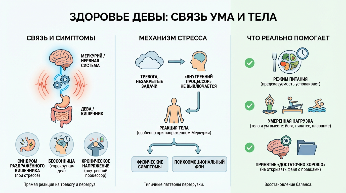 У Девы есть прямая связь между тем, что в голове, и тем, что в теле. В классической астромедицине Меркурий управляет нервной системой, а Дева как знак — кишечником. Эта связь у Дев часто буквальная: тревога, незакрытые задачи, перегруз — и тело реагирует.