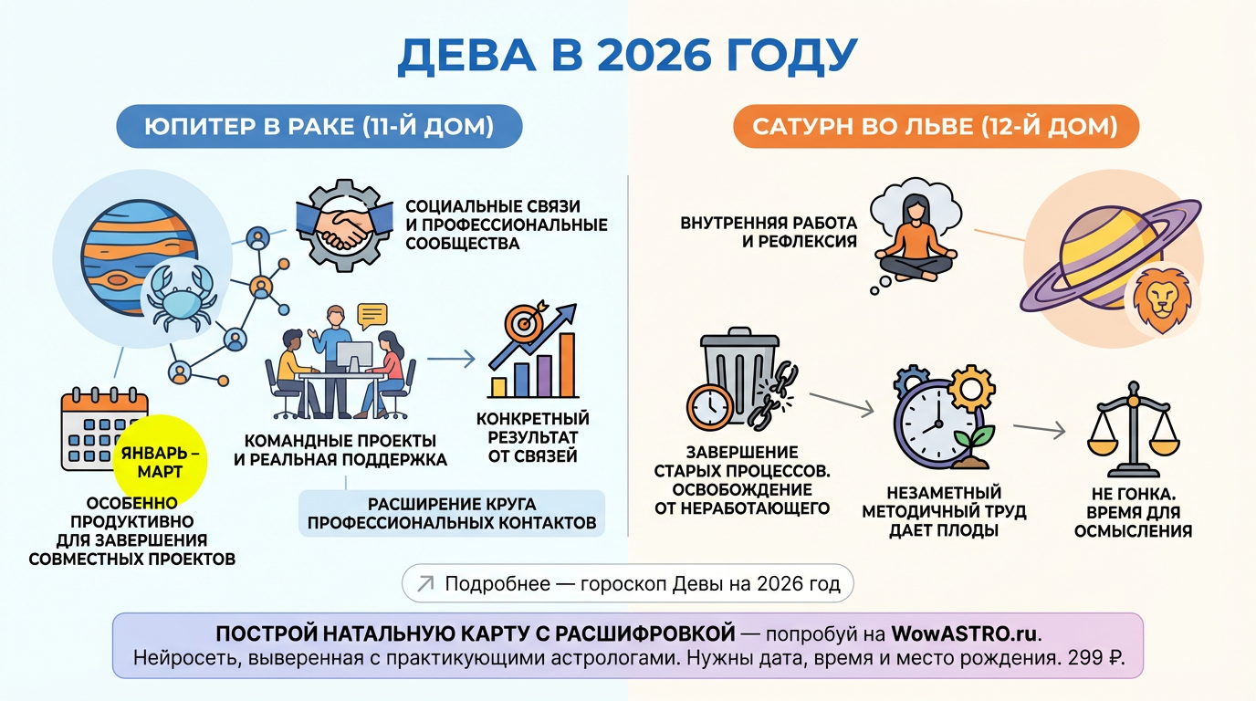 Юпитер в Раке активирует 11-й дом — социальные связи, профессиональные сообщества, командные проекты. Это время, когда Дева, склонная работать в одиночку, получает от коллективов реальную поддержку. Хорошее время расширить круг профессиональных контактов — не для светских знакомств, а для тех связей, которые дают конкретный результат. Январь–март особенно продуктивны для того, чтобы наконец завершить совместные проекты, которые давно откладывались.