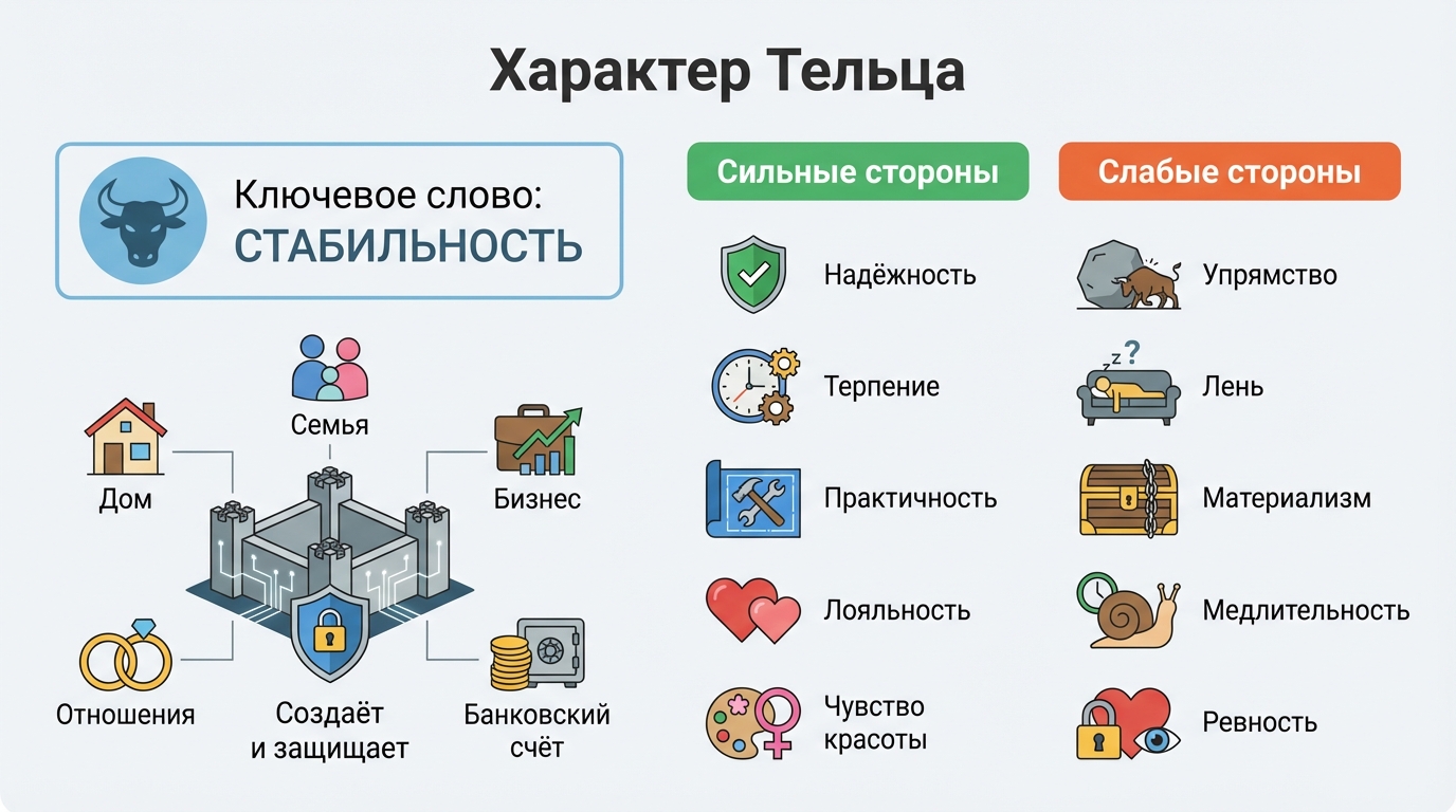 Ключевое слово: стабильность. Телец не любит перемен. Не потому что боится, а потому что знает цену тому, что уже построено. Он создаёт — и защищает созданное. Дом, семью, бизнес, отношения, банковский счёт.