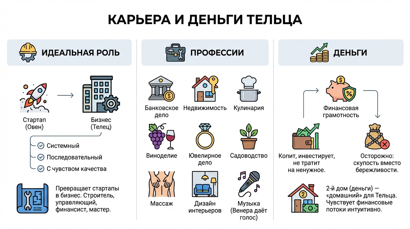 Идеальная роль: строитель, управляющий, финансист, мастер. Телец не создаёт стартапы (это Овен) — он превращает стартапы в бизнес. Системный, последовательный, с чувством качества.